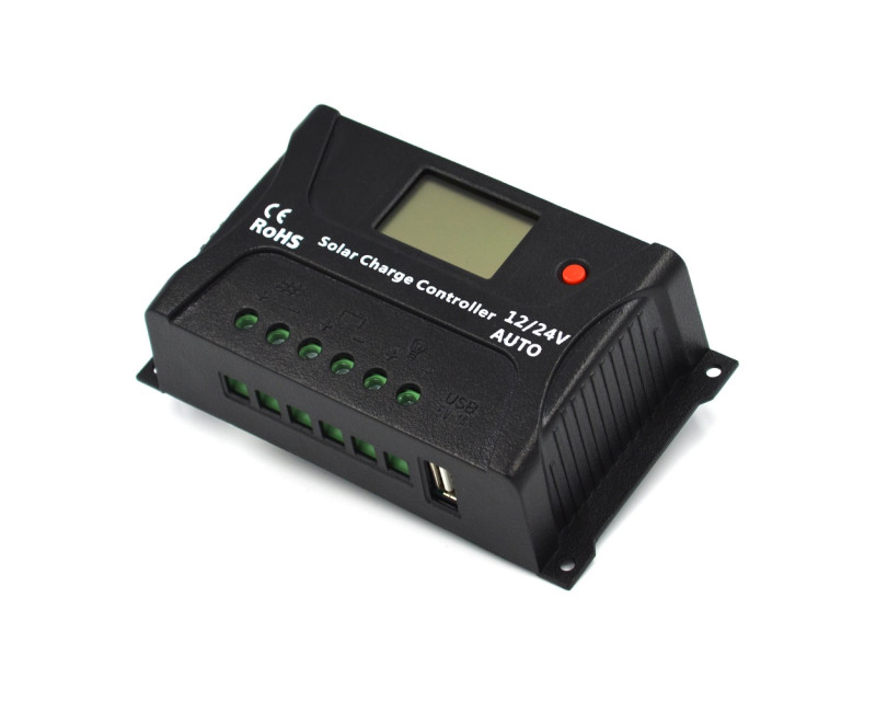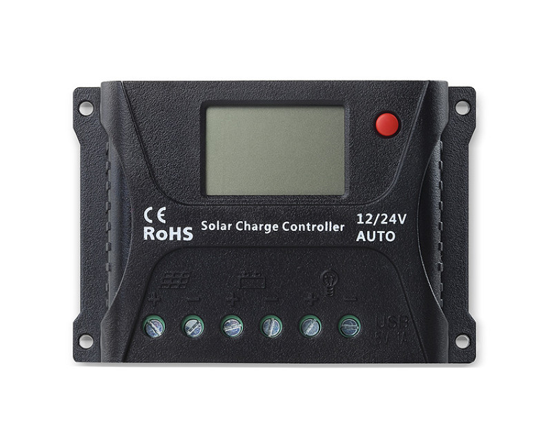 PWM regulátor kontroluje nabíjení a vybíjení baterie - upravuje napětí ze solárního panelu tak, aby bylo využitelné pro nabíjení akumulátoru a provoz 12V/24V zátěže.