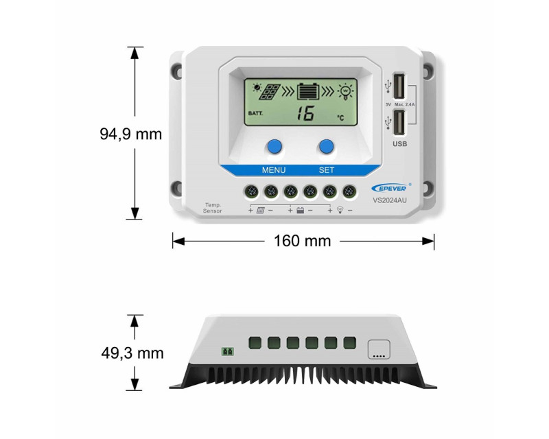Epever VS2024AU solární PWM regulátor, 12/24V, 20A s LCD displejem série VS