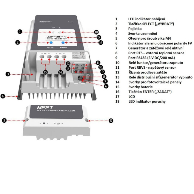Přímo v MPPT regulátoru je integrován multifunkční displej pro snadný monitoring systému a případné nastavení provozních parametrů vč. kontrolních LED diod. Regulátor z řady Tracer AN je založený na technologii vícefázového synchronního usměrnění (MSRT) a pokročilém řídicím algoritmu MPPT, s architekturou dvoujádrového procesoru a společným mínus pólem. MSRT může zaručit velmi vysokou účinnost přeměny v jakémkoli nabíjecím výkonu, což zřetelně zlepšuje energetickou účinnost solárního systému.
