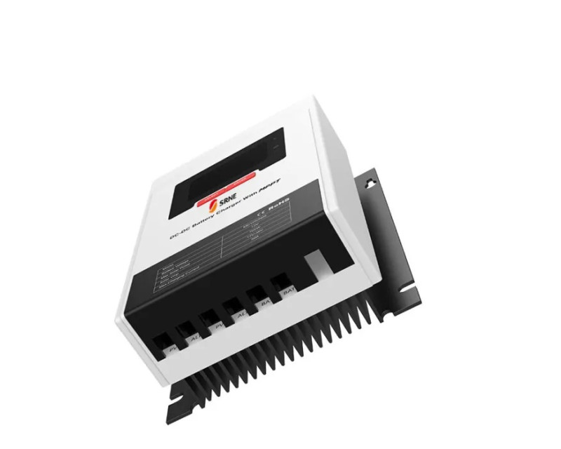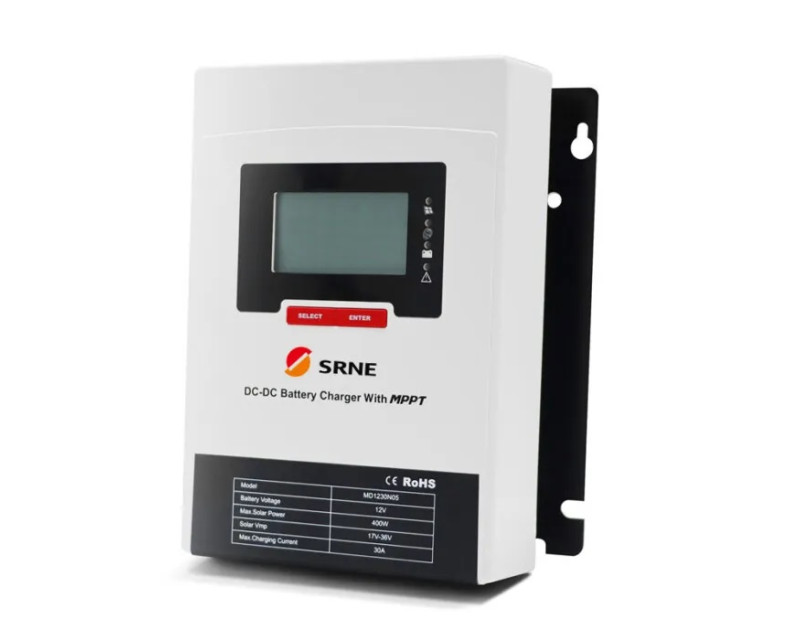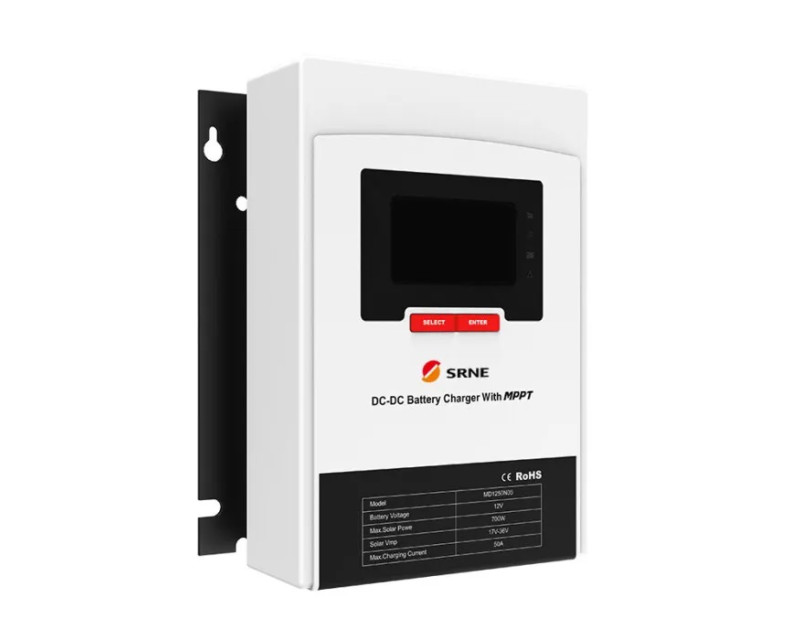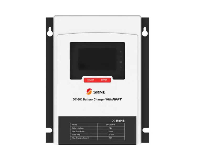 SRNE MD1250N05 solární MPPT regulátor s DC/DC nabíječkou a displejem. Účinnost sledování MPPT je 99,9%. Podporuje olověné, gelové, uzavřené, údržbové a lithiové baterie.