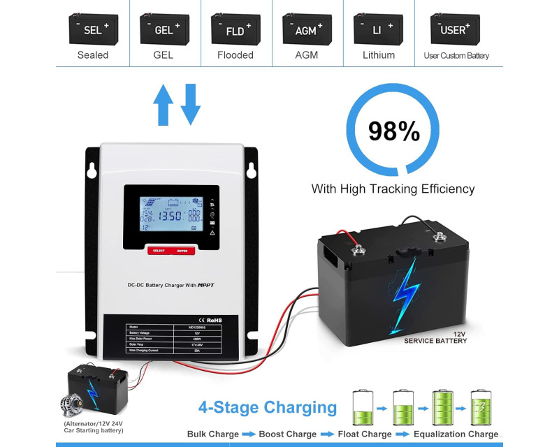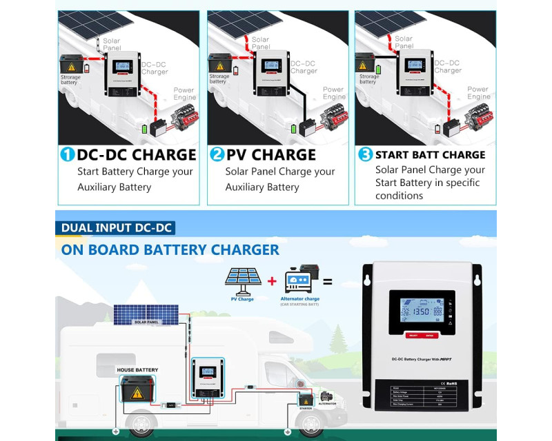Tento produkt je DC/DC inteligentní nabíječka pro vaše baterie ve vozidle nebo lodi. Nabíjet můžete 2 způsoby. Výrobou energie fotovoltaikou/solárními panely nebo přímo vyrábět energii pomocí alternátoru/generátoru.