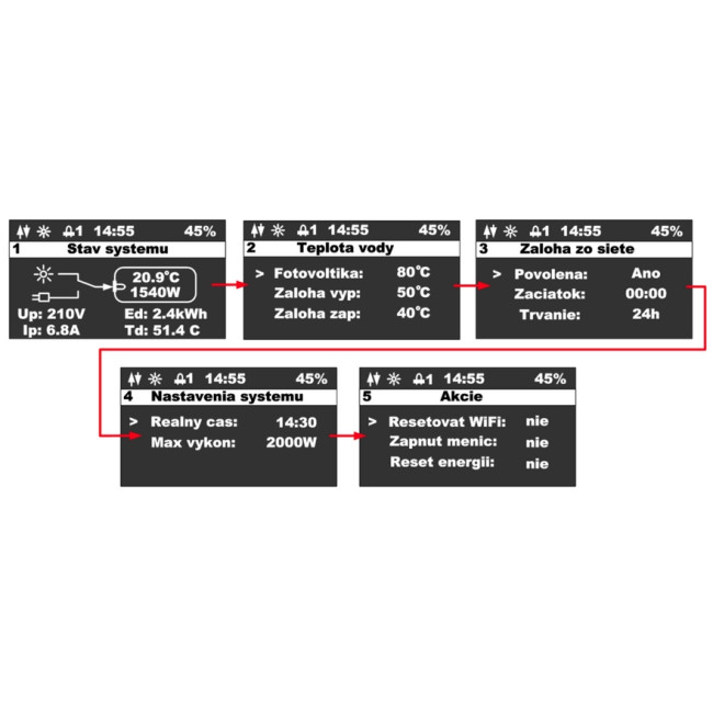 - Solární střídač přepne ohřev na sekundární výstup v případě, že teplota vody na externím čidle dosáhla nastavené teploty pro ohřev fotovoltaikou nebo i v případě, že obvod byl odpojený termostatem (zařízení detekuje nulový proud).