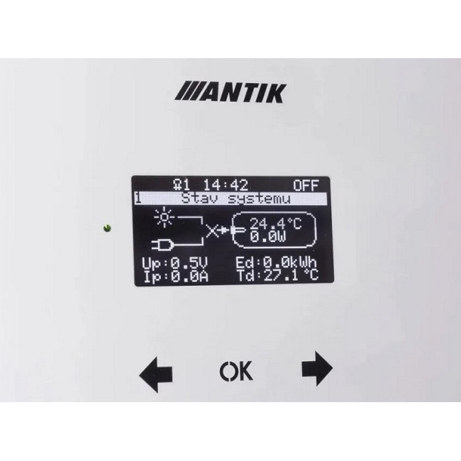 Regulátor ANTIK zajišťuje sledování správné teploty vody v bojleru podle vašeho nastavení. Je možné použít čistě solární režim nebo záložní režim 230V pro případ, že voda v bojleru není dostatečně ohřátá.