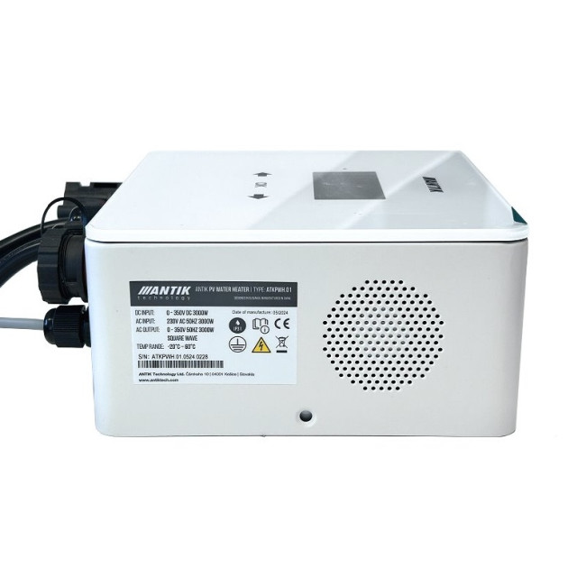 - Regulátor Antik Water Heater PWH 01 V3 je z výroby nastavený na výkon 2000 Watt a v menu měniče lze nastavovat-zvýšit výkon po 50 Wattech až do 3000 Watt a to díky aktivnímu smart chlazení s ventilátorem. Ventilátor má řízené otáčky, od 40°C uvnitř zařízení se začne točit na minimálních otáčkách, při 60°C jde na maximálních otáčkách. Pokud teplota dále stoupá, začne se omezovat výkon. K regulátoru je dodáváno teplotní čidlo (snímač), díky kterému je možné nastavit konečnou teplotu.