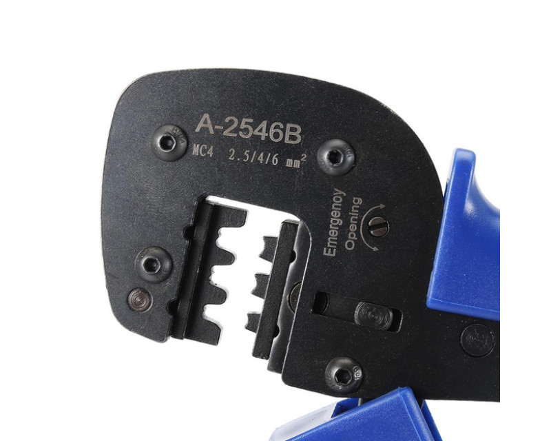 Krimpovací klešte lisovací A-2546B pro solární konektory MC4 - 2,5 - 6 mm2. Vysoce přesný ráčnový mechanismus s velkým tlakem na krimpovací čelisti s minimem ruční síly.