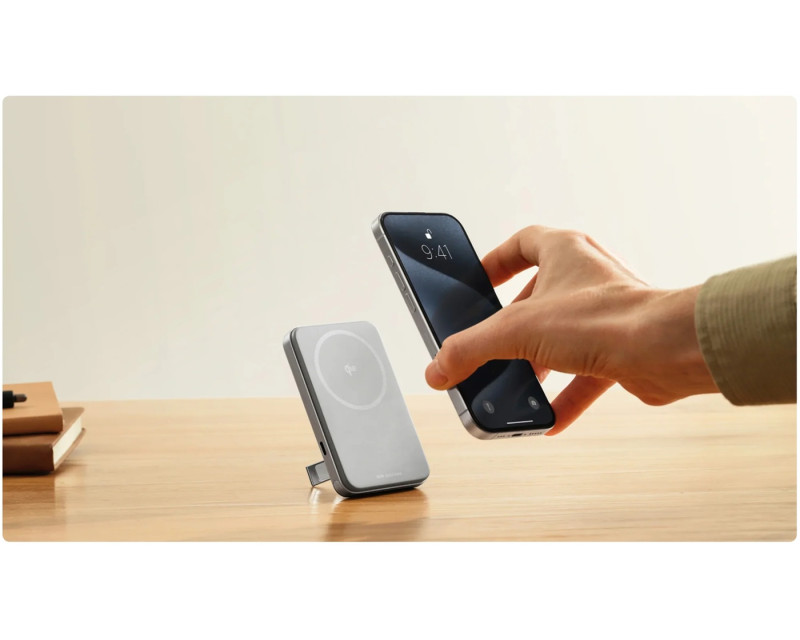 Tato powerbanka zároveň výborně kombinuje elegantní design s praktičností. To dokládá i zajímavý a praktický detail: Pevné magnetické uchycení mobilu pomocí magnetů N52 a vestavěný stojánek umožňují její využití i jako stojanu, který zajistí uchycení mobilu na podložce, a to v horizontální nebo vertikální poloze. Bude tak připraven například pro pohodlné sledování videí nebo četbu zpráv.