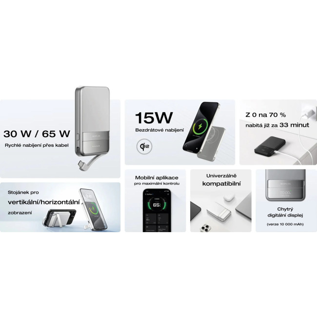 Tato powerbanka zároveň výborně kombinuje elegantní design s praktičností. To dokládá i zajímavý a praktický detail: Pevné magnetické uchycení mobilu pomocí magnetů N52 a vestavěný stojánek umožňují její využití i jako stojanu, který zajistí uchycení mobilu na podložce, a to v horizontální nebo vertikální poloze. Bude tak připraven například pro pohodlné sledování videí nebo četbu zpráv.