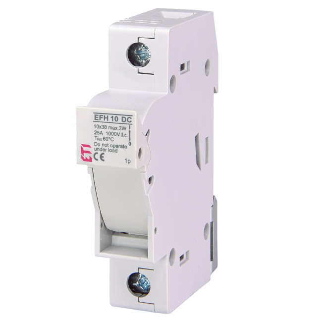 002540201 Spodek pojistkový EFH 10 DC 1p, ETI. Součástí odpínače je pojistka ETI 6A/1000VDC – pojistka je vložena v odpínači.