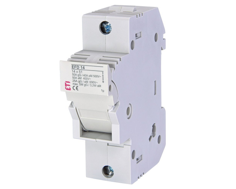 Pojistkový spodek zajišťuje, že pojistkový článek není v kontaktu s krytem. Do pojistkového držáku EFD 14 lze namontovat celou řadu pojistkových vložek. Montáž na DIN lištu.
