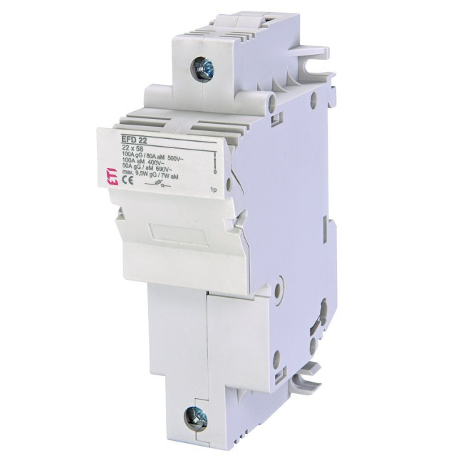 Pojistkový spodek zajišťuje, že pojistkový článek není v kontaktu s krytem. Do pojistkového držáku EFD 22 lze namontovat celou řadu pojistkových vložek. Montáž na DIN lištu.