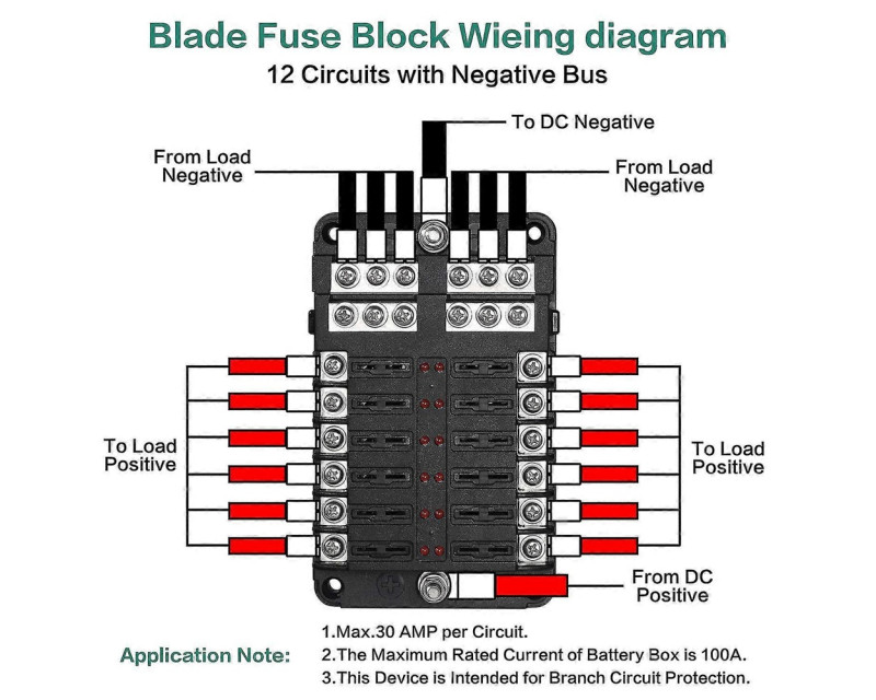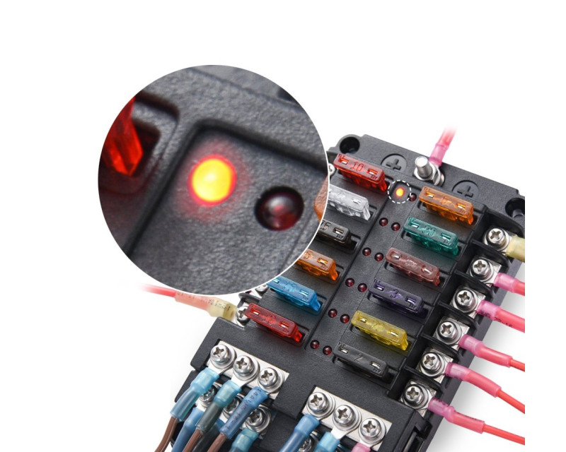 Distribuční blok pojistek s centrálním přívodem kladného i záporného pólu a 12 pojistkami s optickou kontrolou stavu přerušení (12× LED). V dodávce rovněž samolepky s anglickými názvy chráněných objektů.