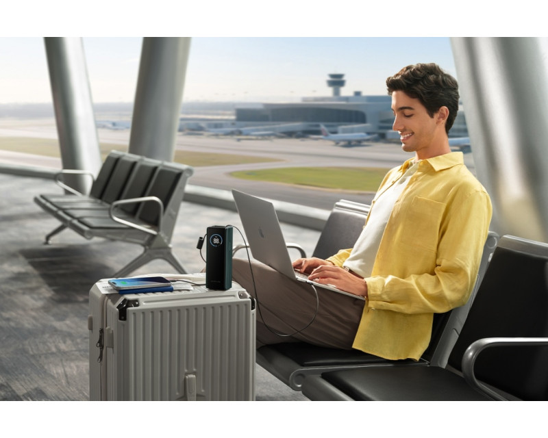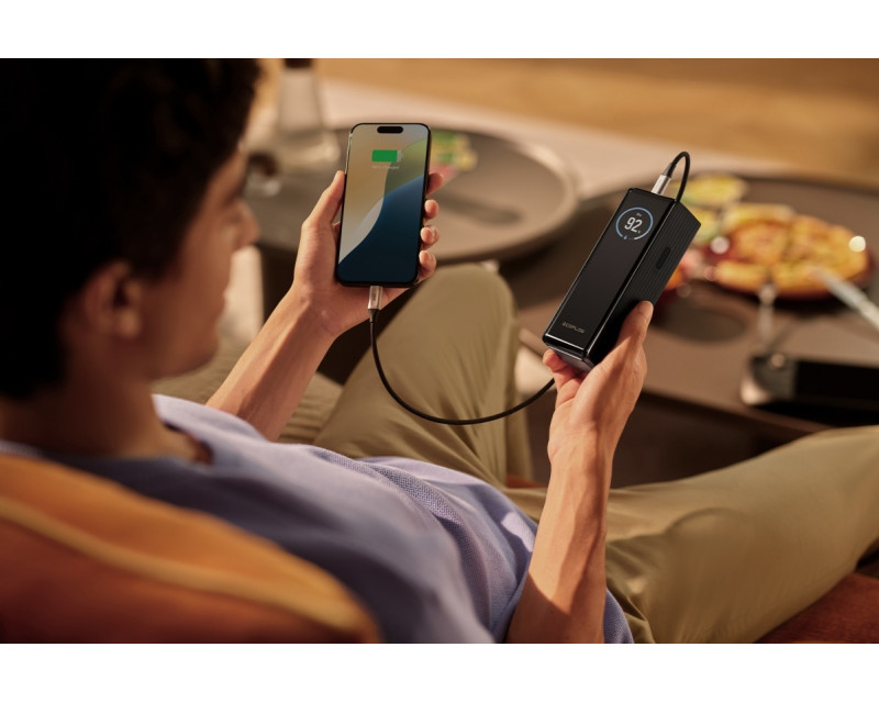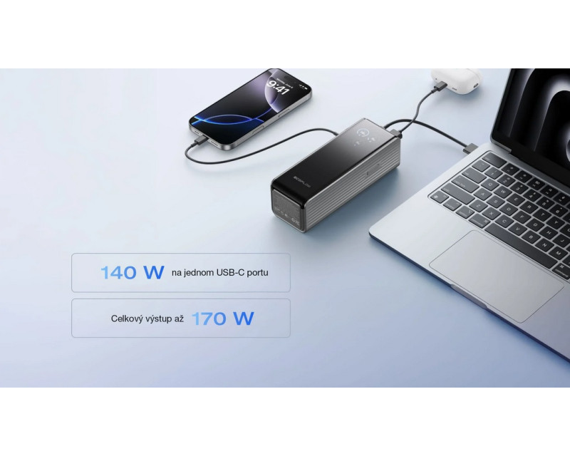 Dokáže nabíjet současně tři zařízení a to kombinovaně až 170 W celkově. Powerbanka disponuje 2x USB-C, které umí samostatně zásobovat zařízení výkonem až 140W. K dispozici je také USB-A, které samostatně nabízí výkon až 33W. Unikátní je rychlost nabíjení Powerbanky Rapid 25000mA, dokáže se nabít z 0-80% za pouhých 37 minut.