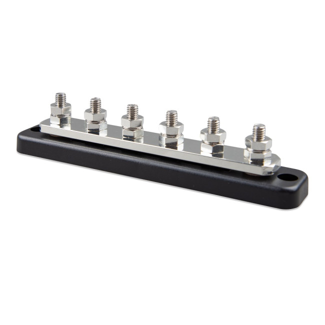 DC Přípojnice se používají pro distribuci vysokého DC proudu a současně take slouží jako připojení pro baterie a/nebo DC zařízení. Nabízíme přípojnice s různým jmenovitým proudem a různým počtem připojovacích svorek. Každá přípojnice je vybavena odnímatelným ochranným krytem.