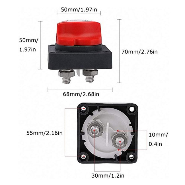 Bateriový odpojovač Battery Switch ON/OFF 275A je vhodný pro bateriové systémy do 30 V. Má jedinečný ergonomický a estetický design knoflíku. Knoflík je odnímatelný z bezpečnostních důvodů nebo za účelem přidání izolace.