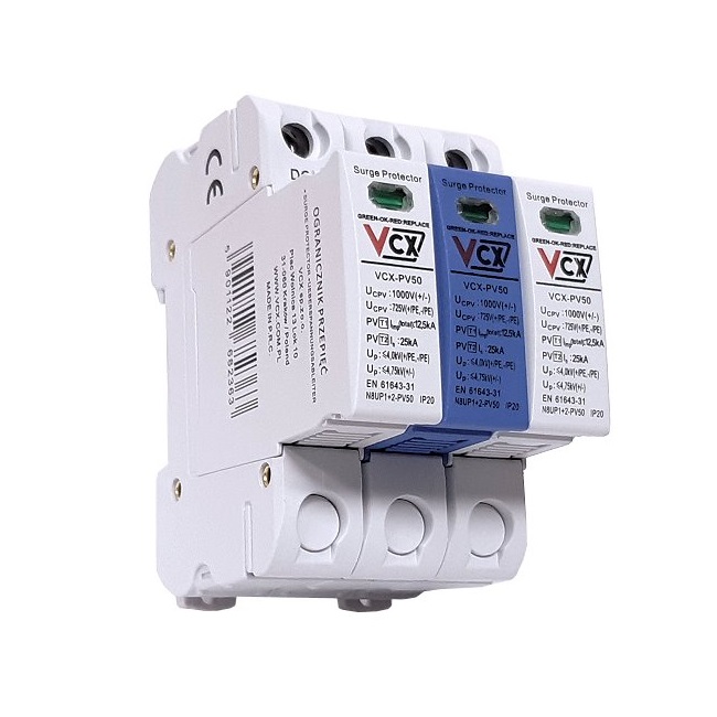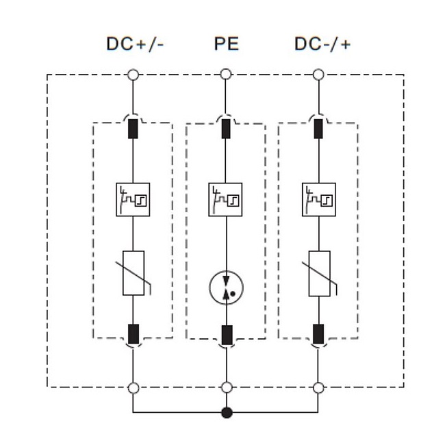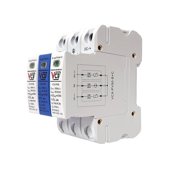 Chránič je vybaven varistory (MOV) v modulech DC+ a DC- a plynovým jiskřištěm (GDT) v modulu PE, což účinně eliminuje problém stárnutí jiskřiště vlivem tzv. svodového proudu a provozního proudu. Jsou vybaveny vizuálním indikátorem provozu (zelená - ochrana, červená - bez ochrany).