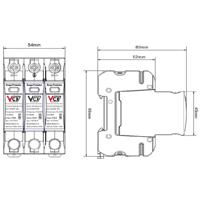 Přepěťová ochrana VCX PV50 DC třída T1T2 (B+C) 3P 1000V 12.5 kA GDT s plynovým jiskřištěm