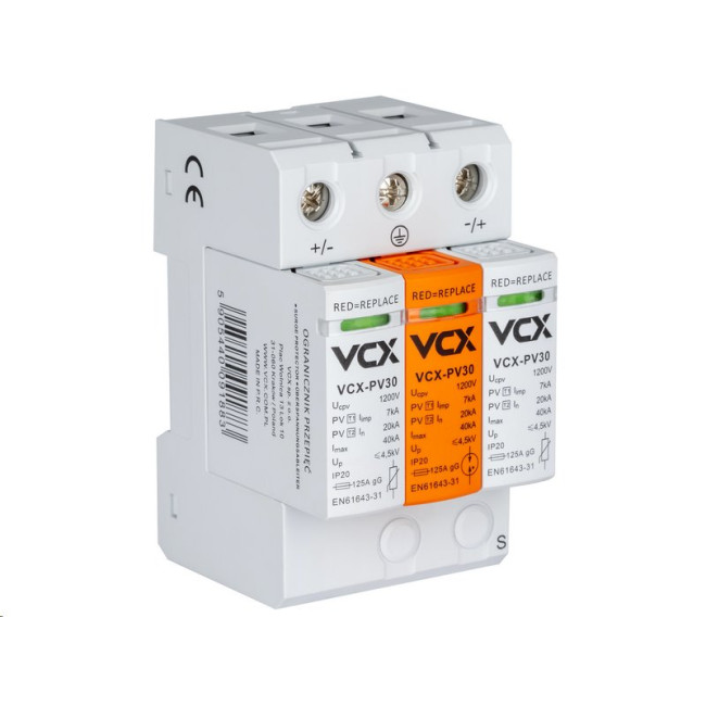 Přepěťová ochrana VCX PV30 DC třídy T1+T2 (B+C) 3P 1200V 7kA je špičkové řešení pro ochranu stejnosměrné části solární elektrárny. Je speciálně navržena tak, aby spolehlivě ochránila komponenty FVE před účinky atmosférických jevů i přepětí z jiných zdrojů.