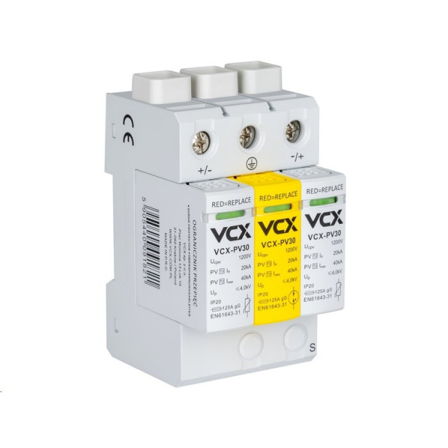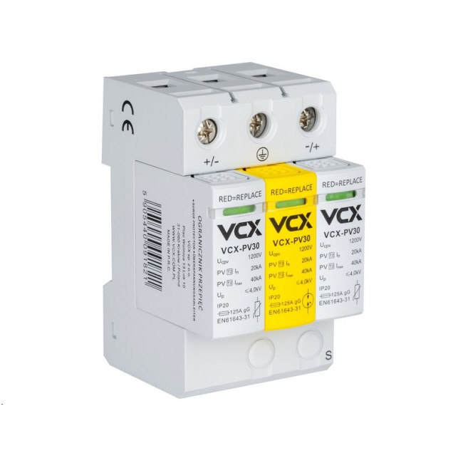 Přepěťová ochrana VCX PV30 DC třídy T2 (C) 3P 1200V je špičkové řešení pro ochranu stejnosměrné části solární elektrárny. Je speciálně navržena tak, aby spolehlivě ochránila komponenty FVE před účinky atmosférických jevů i přepětí z jiných zdrojů.