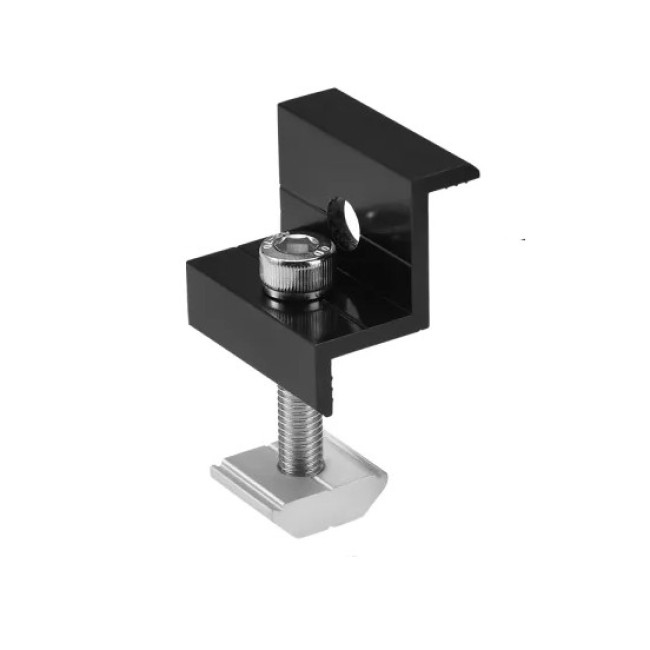 Je určen pro snadné uchycení prvního a posledního solárního panelu na hliníkovou lištu řady H a SC. Použijte vždy 2 držáky na každé straně panelu. Pokud máte instalováno více panelů, použijte středový držák, který se umísťuje mezi panely. Upevňuje se pomocí imbusového klíče M8.