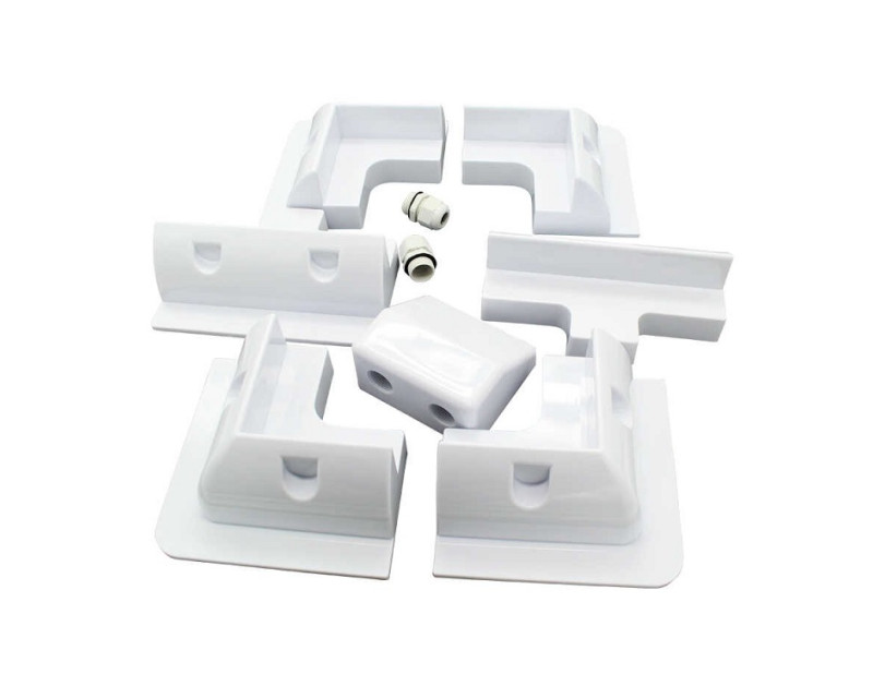 Sestava obsahuje: 7 ks (4ks rohových držáků, 2ks podélných držáků, 1ks průchodka)