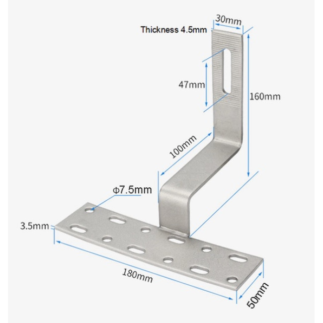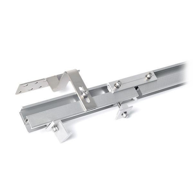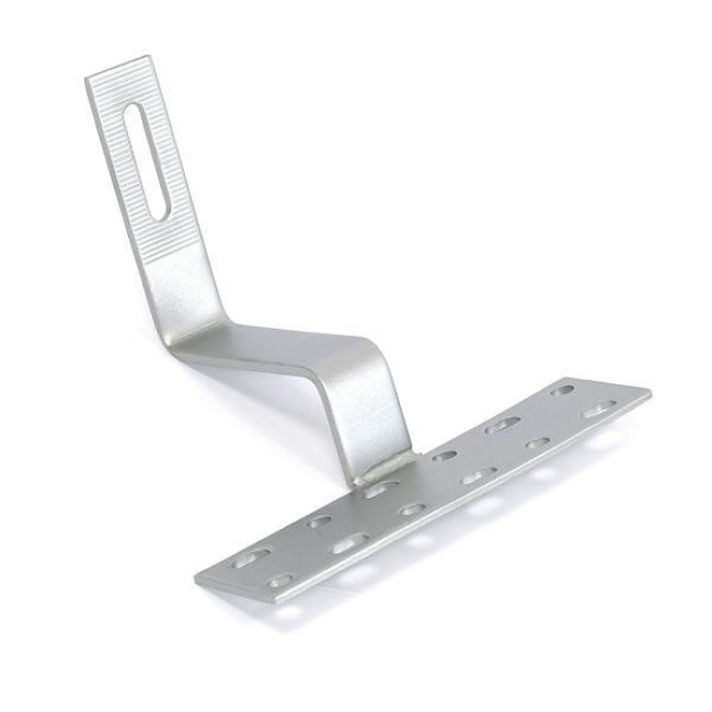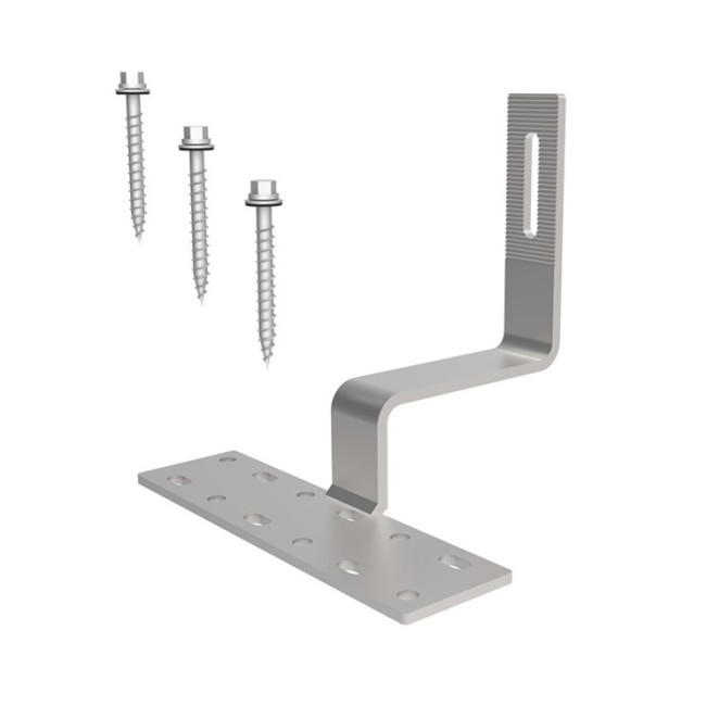 Střešní hák ocelový pro uchycení solárních panelů. Masivní střešní hák pro lišty odolá těžkému sněhu i větru a slouží pro připevnění solárních panelů na šikmé střechy s taškovou krytinou. Připevňuje se vruty na střešní trámy.