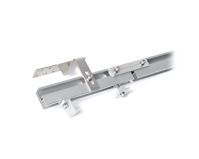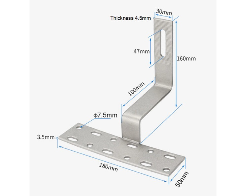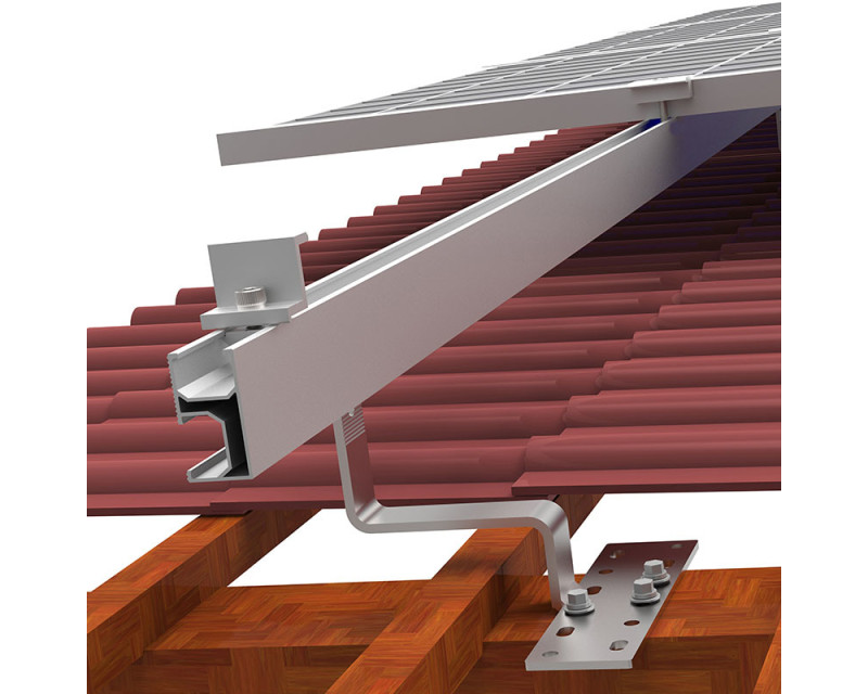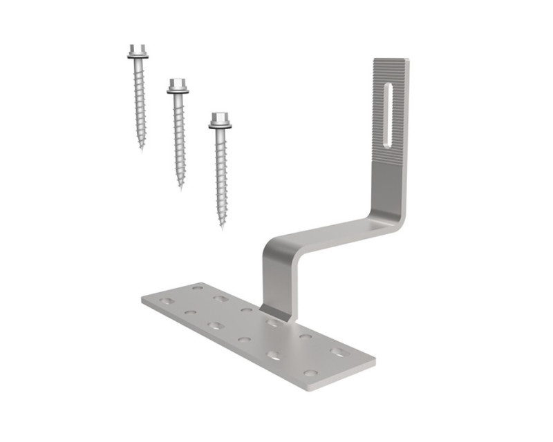 Střešní hák ocelový pro uchycení solárních panelů. Masivní střešní hák pro lišty odolá těžkému sněhu i větru a slouží pro připevnění solárních panelů na šikmé střechy s taškovou krytinou. Připevňuje se vruty na střešní trámy.