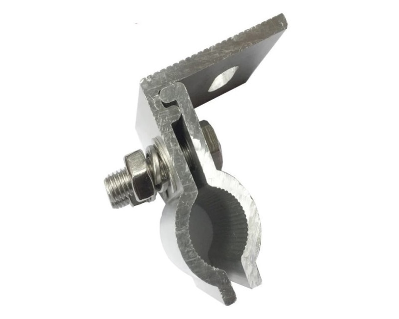 Smontovaný kompletní držák solárního panelu určený pro instalace na plechové střechy. Uchycení se provádí na šev (spojení) plechů. Tím není třeba krytinu porušit. Upevňuje se pomocí imbusového klíče M8. Součástí držáku je GUMOVÉ TĚSNĚNÍ
