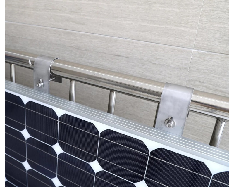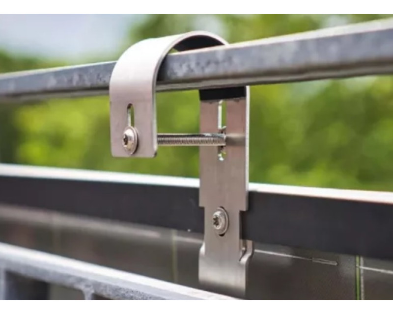Držák pro solární panely na balkonové zábradlí. Uchycení odolá těžkému sněhu i větru a slouží pro připevnění solárních panelů na balkonové zábradlí.