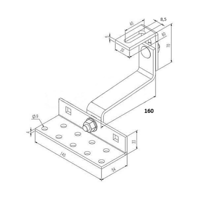 Střešní hák nastavitelný, ocelový pro uchycení solárních panelů. Masivní střešní hák pro lišty odolá těžkému sněhu i větru a slouží pro připevnění solárních panelů na šikmé střechy s taškovou krytinou. Připevňuje se vruty na střešní trámy.