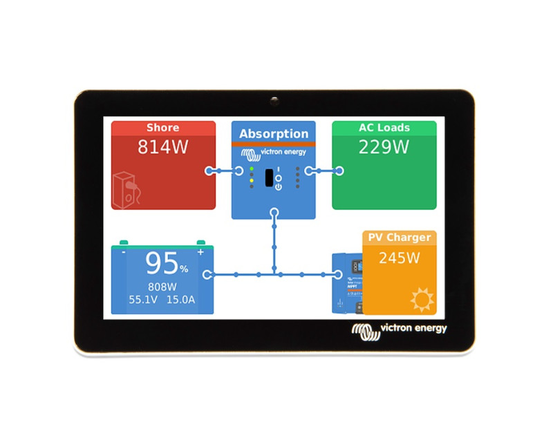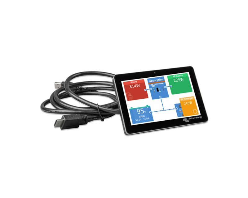 Dotykový displej GX Touch 50 je příslušenství pro Cerbo GX. Pětipalcový dotykový displej poskytuje okamžitý přehled o vašem systému a umožňuje rychle upravit nastavení. Je jednoduše připojen k Cerbo GX pomocí jediného kabelu. Jeho velmi tenký vodotěsný design, nastavení nahoru a jeho jednoduchá instalace přinášejí velkou flexibilitu.