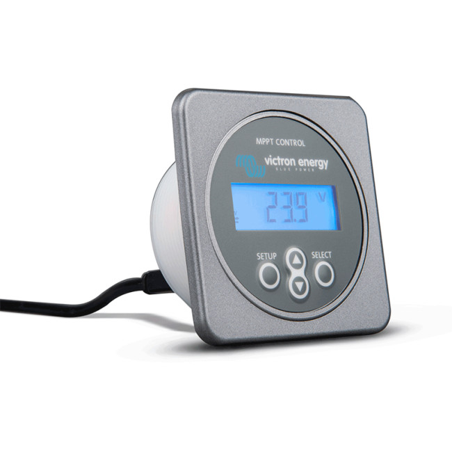 Modře podsvětlený digitální displej k Victron BlueSolar MPPT regulátorům pro sledování aktuálních provozních hodnot, zobrazování historie a nastavování provozních parametrů regulátorů. Je určen pro všechny Victron BlueSolar MPPT regulátory s VE.Direct protokolem se čtyřpinovým portem s výjimkou staršího modelu MPPT 70/15 (již se nevyrábí). Displej není určen pro velké Victron BlueSolar MPPT regulátory 150/70 a 150/85 (jiný komunikační protokol, displej součástí regulátoru).