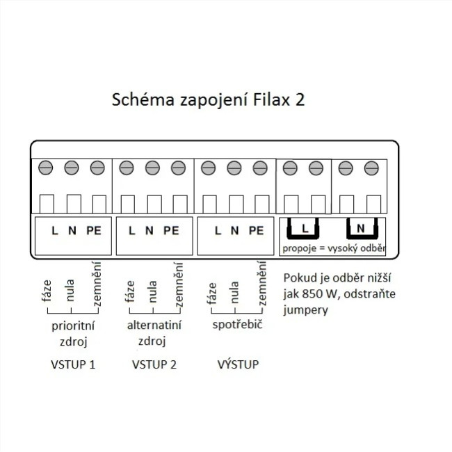 Instaluje se na suché a dobře větrané místo. Vstupy musí být chráněny proti proudům přesahující 16 A. Pokud je souhrnný odběr spotřebičů menší jak 850 W, odstraňují se ze zařízení Filax manuálně propoje (jumpery).