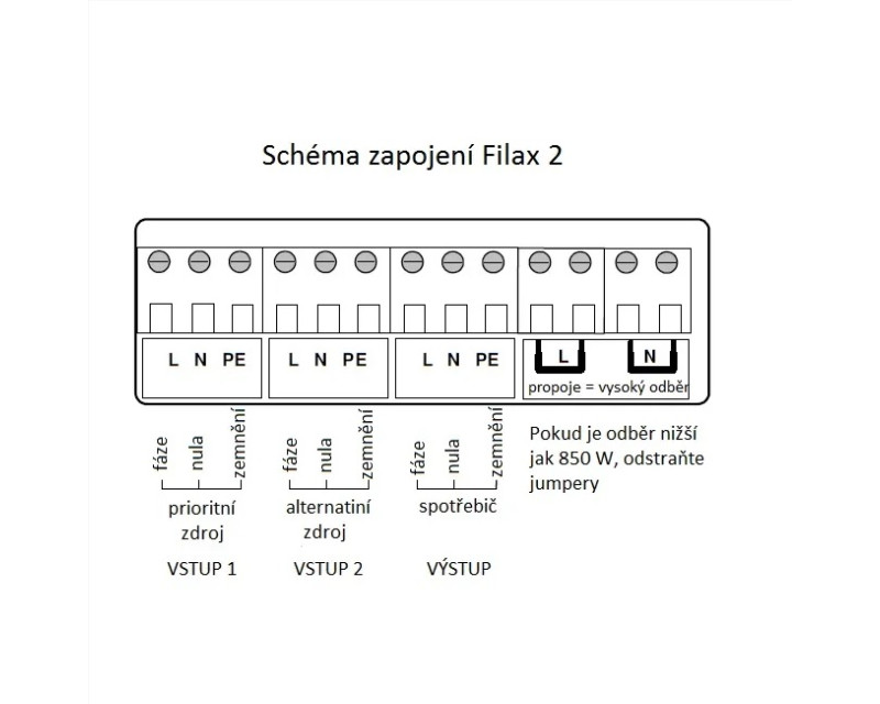 Instaluje se na suché a dobře větrané místo. Vstupy musí být chráněny proti proudům přesahující 16 A. Pokud je souhrnný odběr spotřebičů menší jak 850 W, odstraňují se ze zařízení Filax manuálně propoje (jumpery).