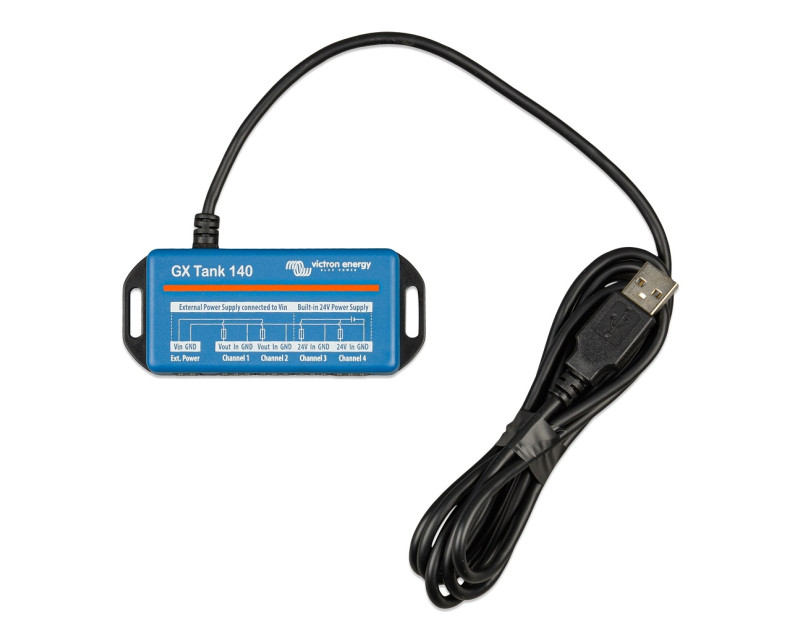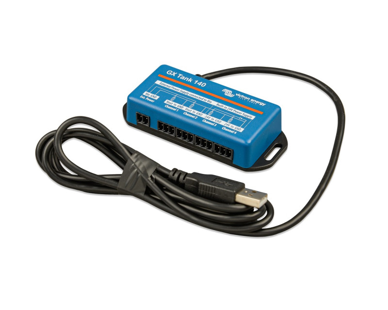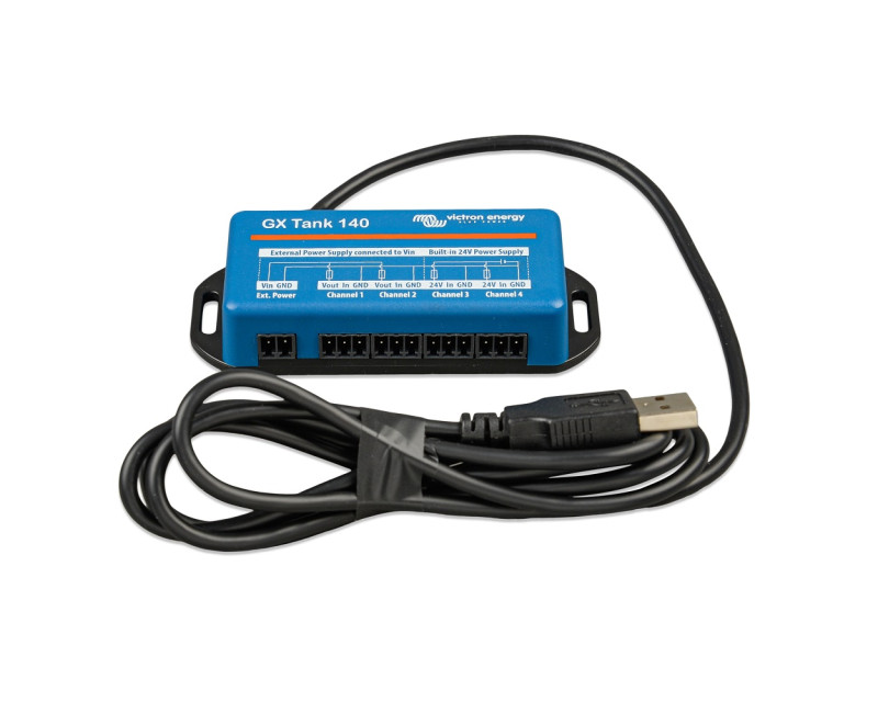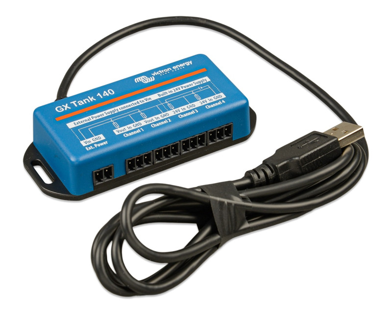 Zařízení GX Tank 140 je kompatibilní s proudovými vysílači (4 až 20 mA) i s vysílači stavu napětí (0 až 10 V). Připojení k zařízení GX je přes USB, což je také způsob, kterým se GX Tank napájí: není vyžadována žádná další kabeláž.