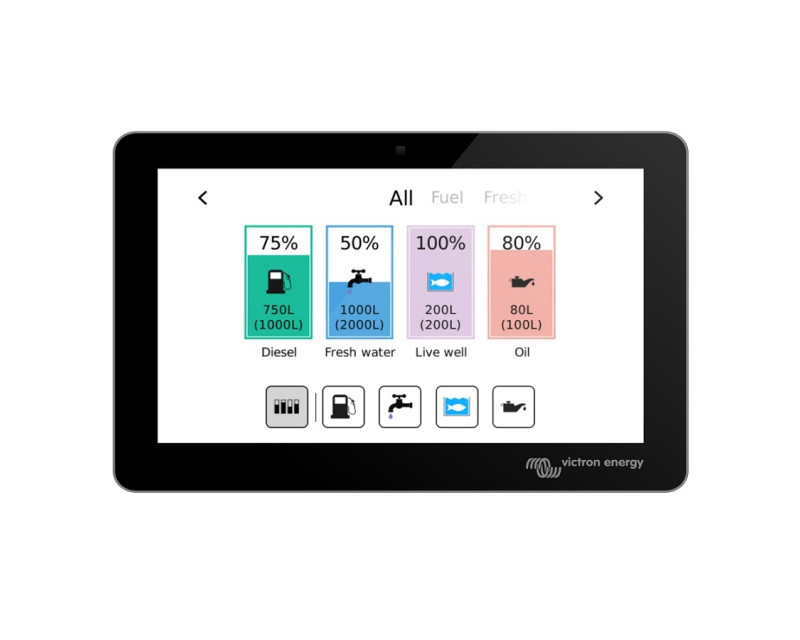 U námořních aplikací může zařízení GX přenášet tyto hodnoty úrovně hladiny v nádrží přes síť NMEA 2000, aby je mohly zachytit další displeje, například MFD.