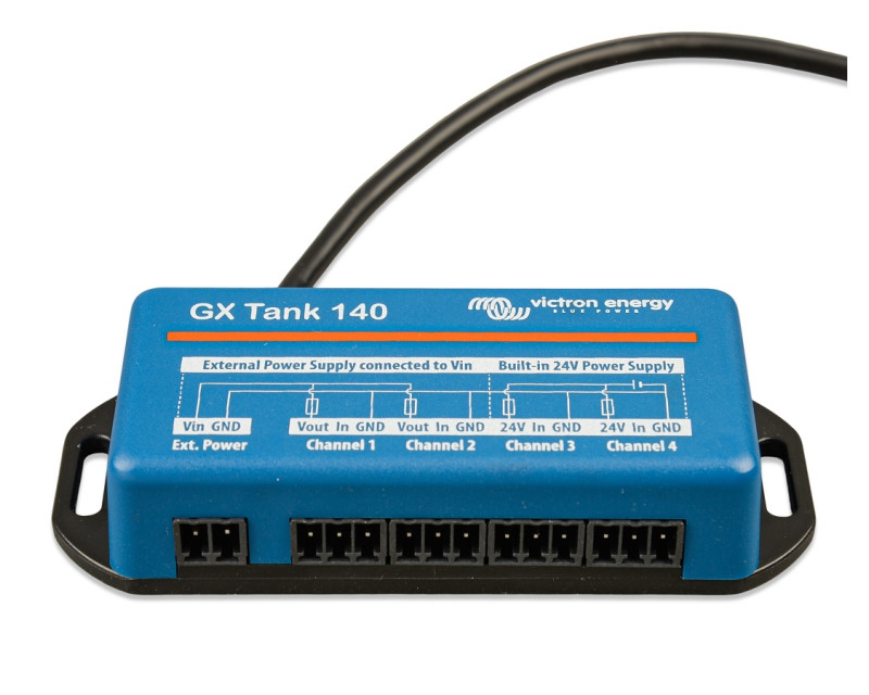 GX Tank 140 odečítá hodnoty až ze čtyř snímačů hladiny v nádržích. Jedná se o příslušenství, které je určeno pro naši řadu produktů pro monitorování systému GX, z nichž je Cerbo GX nejčastěji používaným modelem.