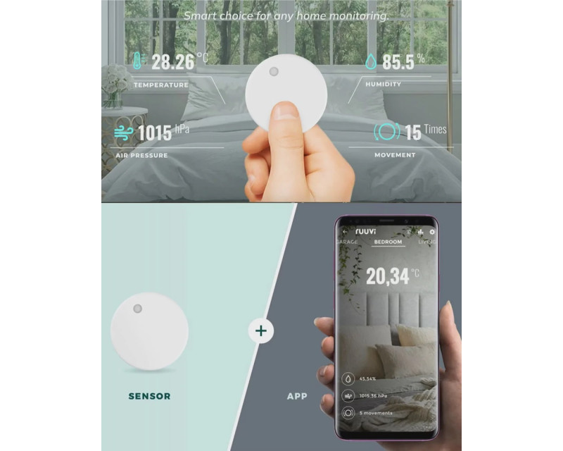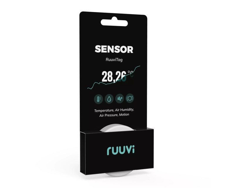 RuuviTag je bezdrátový Bluetooth senzor, který měří teplotu, vlhkost vzduchu, tlak vzduchu a pohyb. Pomocí mobilní aplikace Ruuvi pro Android a iOS můžete zobrazovat aktuální měřená data a jejich historii přímo na displeji vašeho smartphonu.
