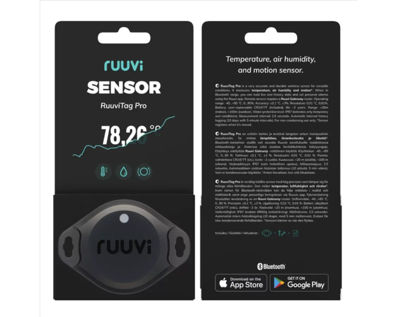 RuuviTag Pro 2in1 je odolný bezdrátový senzor navržený pro přesné měření teploty a pohybových změn pomocí 3 osého akcelerometru. Díky robustnímu vodotěsnému provedení s krytím IP68/IP69K je vhodný pro použití v průmyslu, logistice, skladech i venkovním prostředí. Komunikace přes Bluetooth Low Energy umožňuje snadnou integraci do různých aplikací.
