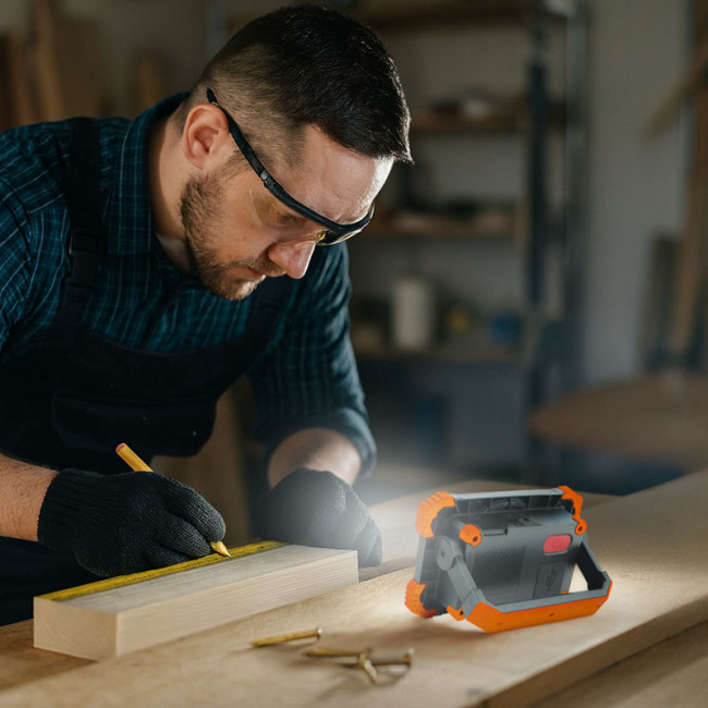 Dobíjení baterie probíhá přes moderní USB-C konektor a trvá přibližně 4 hodiny. Reflektor má stupeň krytí IP54, takže je chráněn proti stříkající vodě a prachu, což jej předurčuje k venkovnímu použití. Světelný kužel o šíři 120° zajistí dostatečné pokrytí plochy. Odolné tělo z ABS a PC plastu v kombinaci s kompaktními rozměry (14 × 10 × 4,5 cm) a barevným provedením v oranžovo-černé barvě dělá z tohoto modelu ideální volbu pro kempování, opravy i nouzové situace.