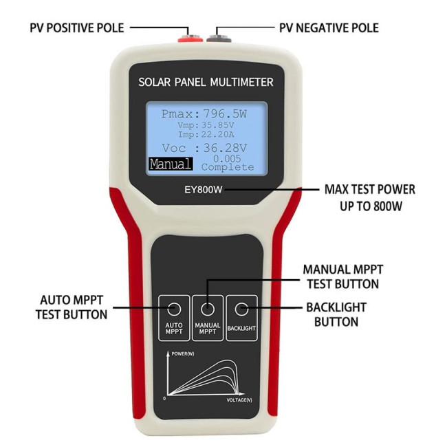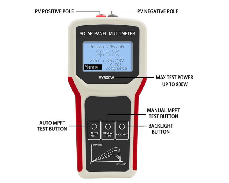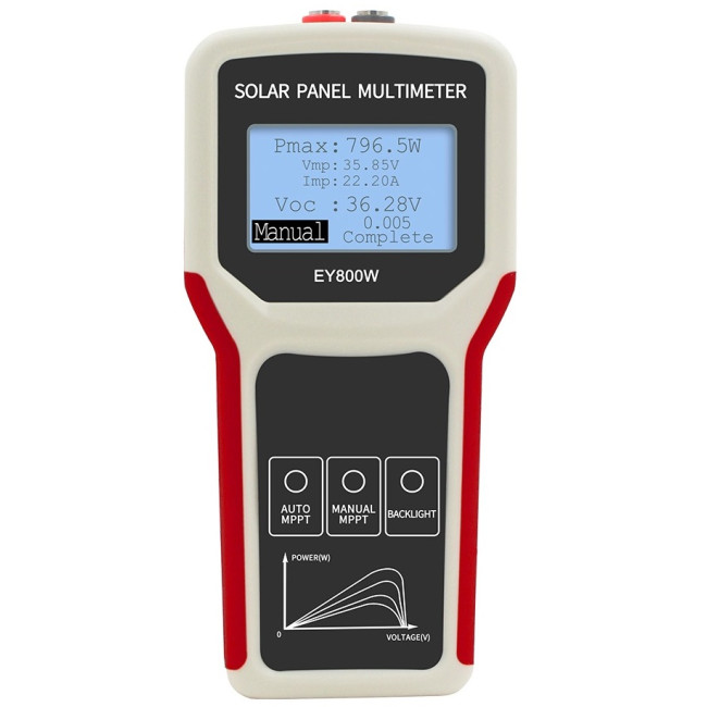 ELEJOY EY800W je tester solárních fotovoltaický panelů. Tento multimetr solárních panelů může testovat maximální bod výkonu a napětí naprázdno fotovoltaického panelu