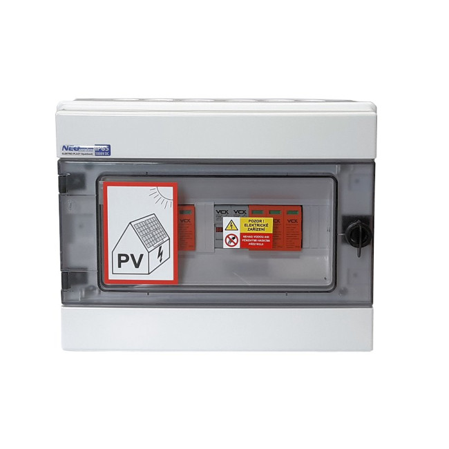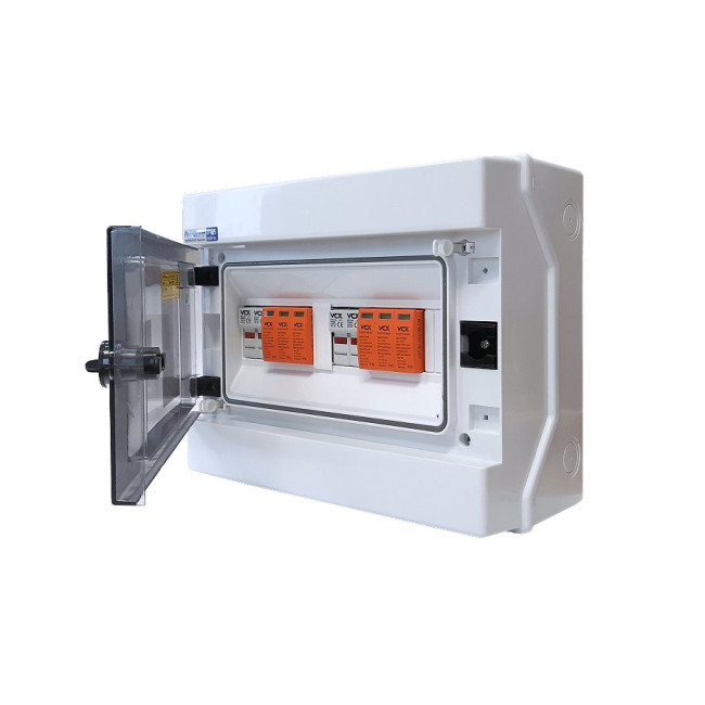 Certifikovaný kompletní DC nástěnný rozvaděč pro 2 stringy s průhledným víkem pro fotovoltaiku. Je určený pro maximální napětí 1000 V DC, nabízí pozice pro 12 modulů a stupeň ochrany IP65.