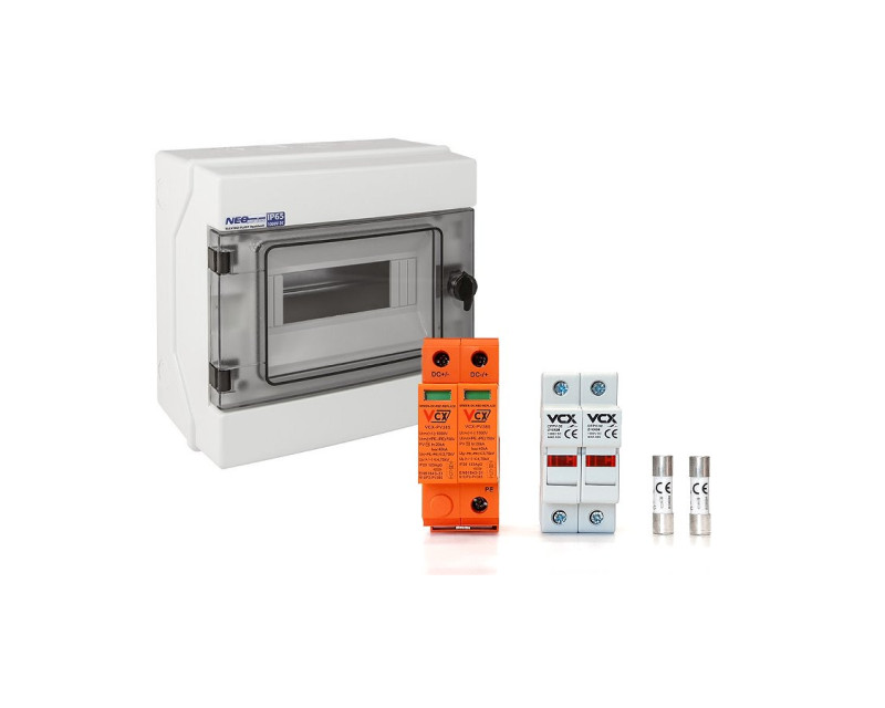 Předpřipravená montážní sada pro fotovoltaiku. Určená pro samostatnou montáž pro 1 string. Dodávka obsahuje rozvaděč + kvalitní komponenty pro fotovoltaiku: přepěťové ochrany, pojistkové odpojovače a pojistky.