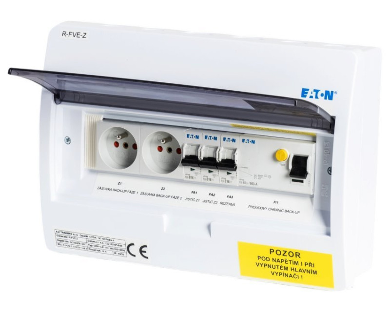 V rozvaděči je osazen jistič B16/1 pro jištění dvou zásuvek a jedné rezervy pro samostatný spotřebič ze zálohy střídače a proudový chránič typu A.