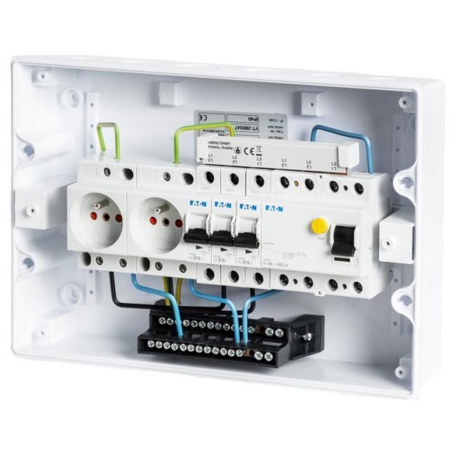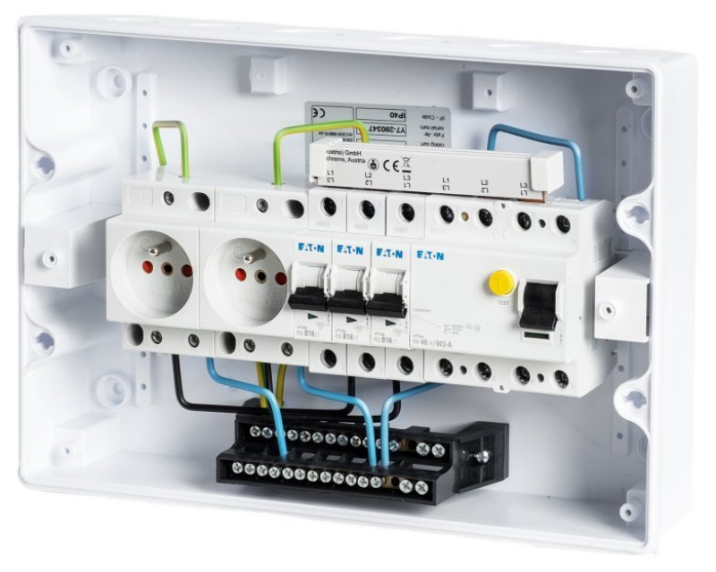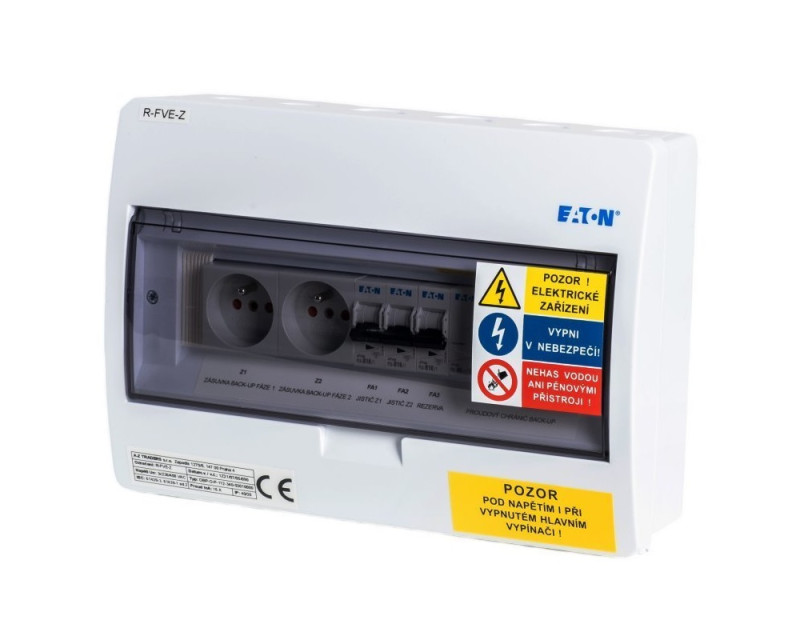 AC rozvaděč určený pro montáž na zeď, třída ochrany II, IP40/20, sloužící pro obsluhu třífázové fotovoltaické elektrárny. Ideální tam, kde není možné využít vybrané okruhy pro zálohu ve stávajícím rozvaděči, ale lze využít pouze zásuvky a rezervní jistič pro vybrané spotřebiče.