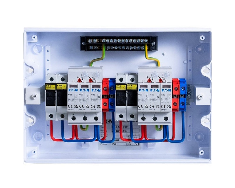 Certifikovaný DC2 rozváděč EATON T2 (třída ochrany II) pro 2 stringy včetně protokolu o zkoušce určený pro montáž na zeď, IP40 sloužící jako vstupní rozváděč od fotovoltaických panelů (ke střídači) pro celé portfolio fotovoltaických elektráren.