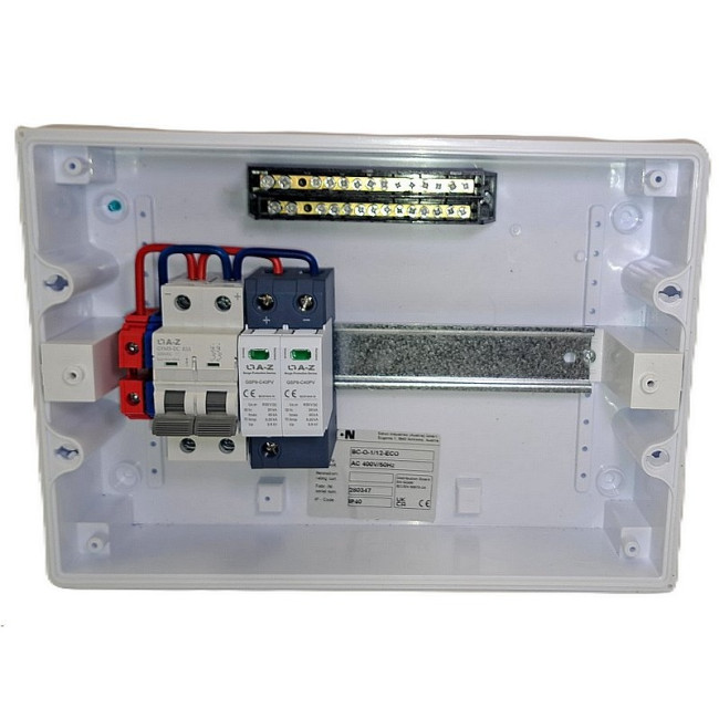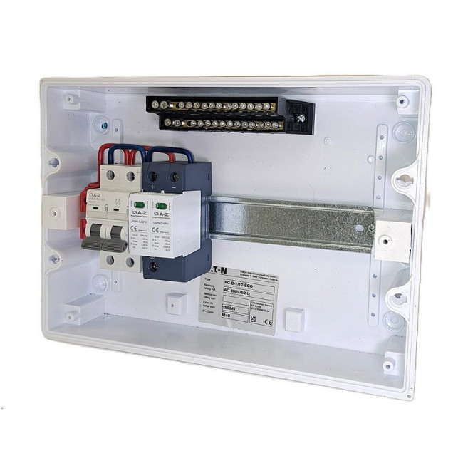 Certifikovaný rozváděč EATON T1+T2 do 500 V DC pro 1 string včetně protokolu o zkoušce určený pro montáž na zeď s krytím IP40. Slouží jako vstupní rozváděč od fotovoltaických panelů (ke střídači) při použití technologie pro ohřev vody, nebo FVE řetězců.