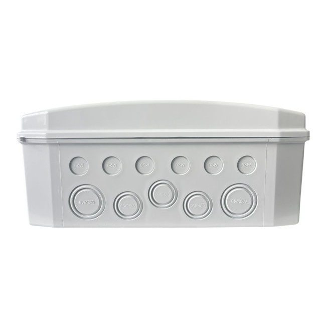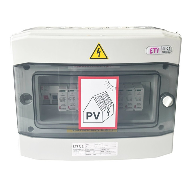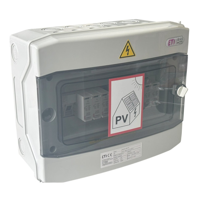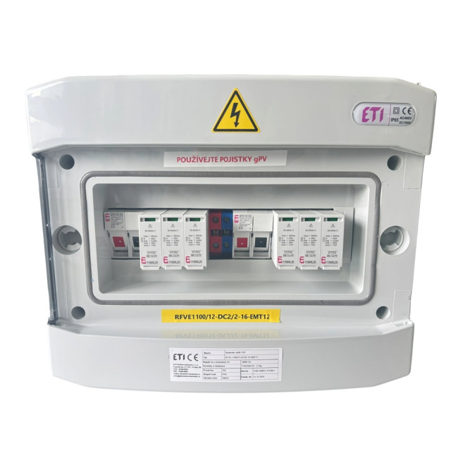 Kompletní nástěnná rozvodnice třídy 1+2, maximální napětí 1000 V určená pro povrchovou montáž a instalaci 2 stringů včetně certifikovace pro využití v rámci fotovoltaického systému. Je vybavena 2 svodiči přepětí T1+T2, 2 pojistkovými odpojovači a celkově 4 pojistkami (10 x 38 gPV 16A/1000V). Stupeň ochrany IP65 znamená, že rozvodnice při správné montáži zcela odolá prachu a tryskající vodě ze všech úhlů.