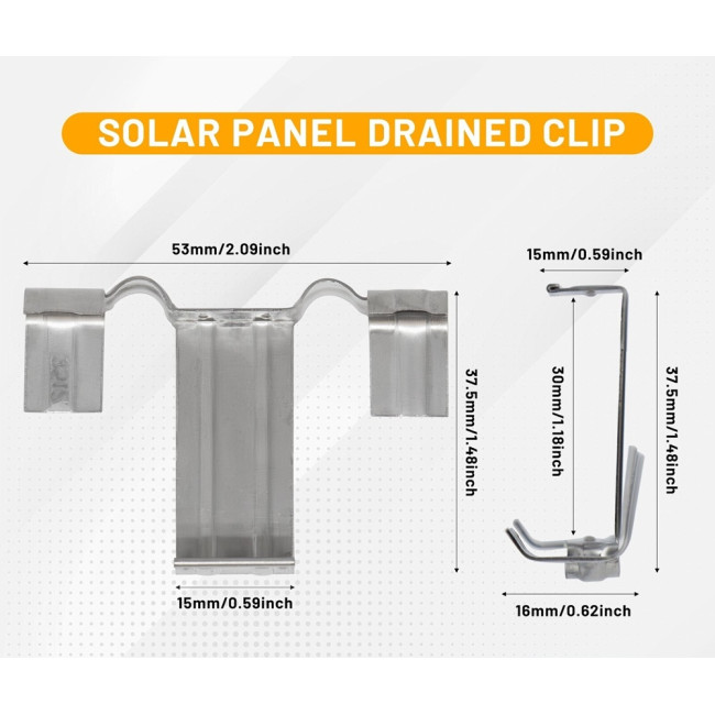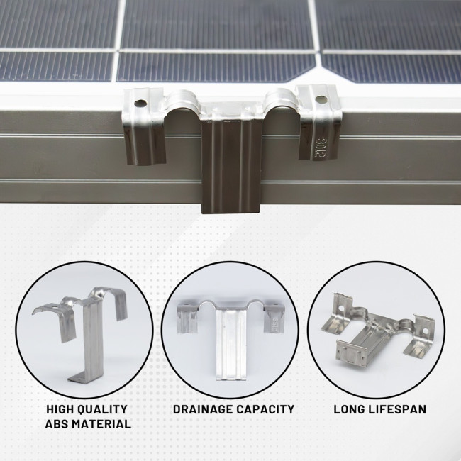 Mnoho fotovoltaických střech má malý úhel sklonu, což způsobuje, že se prach na povrchu modulu při dešti promění v bláto, které stéká k okraji solárního modulu.. Po dlouhodobém nahromadění se nečistoty usazují na spodní straně nebo v rohu solárního panelu, což může vést k usazeninám, což vážně ovlivňuje propustnost světla sklem panelu. Spony pro odvod vody ze solárních panelů mohou odvádět vodu a nečistoty ze solárního panelu a zvyšovat tak výrobu energie.