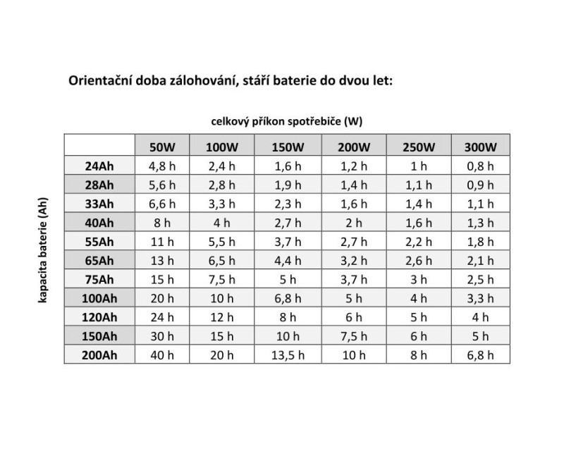 UPS MHPower MPU-300 je ideální jako záložní zdroj k oběhovému čerpadlu, jako záložní zdroj ke kotli nebo jako záložní zdroj ke krbovým kamnům. Díky čisté výstupní sinusové křivce a robustnímu toroidnímu transformátoru je však vhodný i pro zálohování mnoha dalších zařízení jako jsou například domácí spotřebiče, elektrické nářadí, nabíječky, kompresory, čerpadla, motory, elektropohony, kancelářská technika, televizní technika, telekomunikace, servery, PC a ostatní zařízení s napájením až do 300W nepřetržitého provozu. Záložní zdroj můžete využít například i jako UPS do karavanu. Největší předností tohoto zdroje je možnost připojení externí baterie (není součástí zařízení), díky čemuž je schopen napájet připojené spotřebiče po dlouhou dobu v závislosti na zvolené kapacitě baterie viz. tabulka s orientační dobou zálohování.