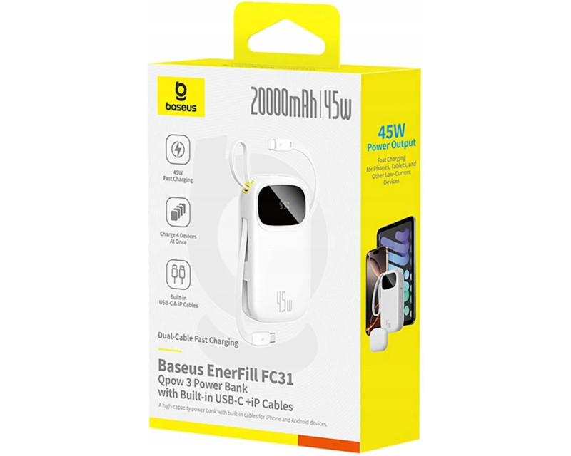 Powerbanka Baseus EnerFill FC31 Qpow 3 20000mAh, 45W, s kabelem USB-C a Lightning bílá